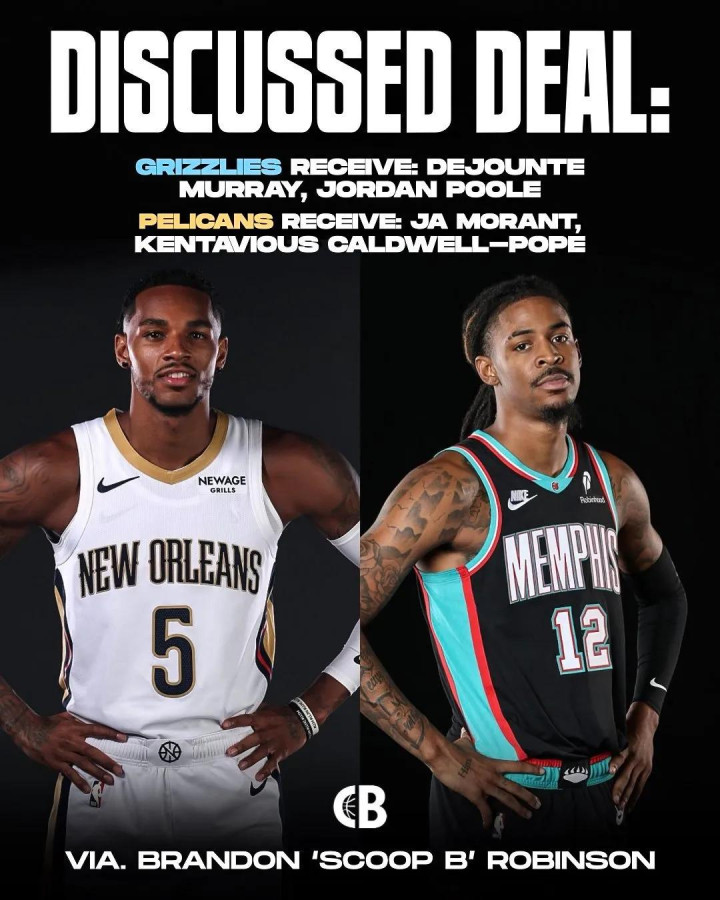 近日美记ScoopB报道称,鹈鹕非常积极追求莫兰特,并与灰熊讨论了多个交易方案,如下: 一、送出普尔+默里,得到莫兰特+波普; 二、送出普尔+鲁尼,得到莫兰特; 三、送出普尔+霍金斯+小乔丹,得到莫兰特。