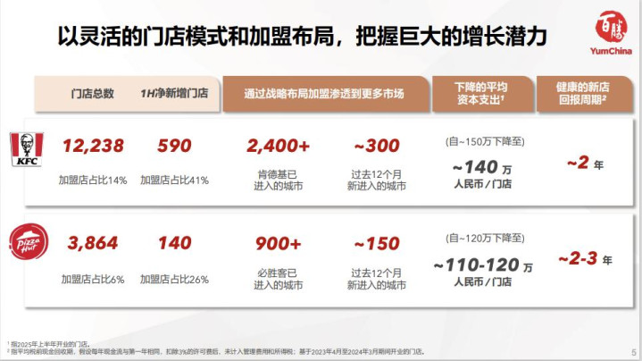 加盟与下沉 百胜中国的加速扩张引擎 2025年下半年,百胜中国将进入新一轮加速开店周期,全年净新增门店目标区间为1600至1800家。 相比单纯追求数量,公司正在通过优化开店模型压低单位投资,释放更高的资本效率。 业绩会资料显示,2025年上半年开业的肯德基和必胜客新店,平均资本支出均低于去年同期。 肯德基从150万元降至约140万元,必胜客则从120万元降至110~120万元。新一代必胜客WOW门店的投资门槛已降至65~85万元。 更轻的模型,也意味着更广的市场接入能力。公司管理层表示,WOW模式以精简的运营结构和更低的入门门槛,有效扩大了必胜客在低线城市的触达半径。 自2024年5月首店开业以来,WOW店已突破200家,并进入10个此前必胜客未布局的新城市。 受益于单店投资成本的下降,百胜中国已将全年资本支出预算从原先的7–8亿美元下调至6–7亿美元。