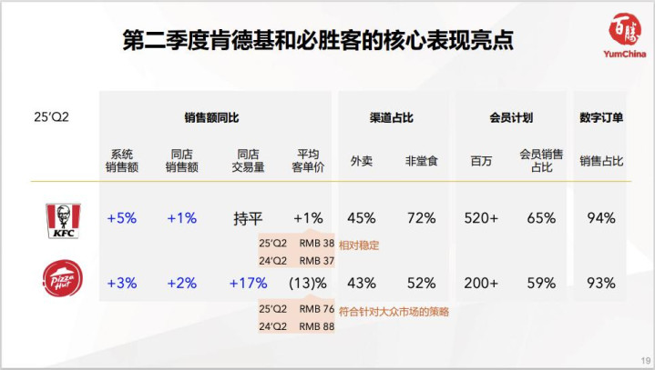 一个季度大赚2亿美元 肯德基提效,必胜客扩量 财报数据显示,百胜中国Q2总收入28亿美元,同比增长4%,经营利润3.04亿美元,同比增长14%,归母净利润2.15亿美元,经营利润率10.9%,同比上升100个基点。 门店方面截至6月30日,百胜中国门店数达到16978家,净增226家,其中,肯德基和必胜客分别新增119家和95家。 利润增速远超收入以及开店数,意味着门店层面单店模型的优化和营运效率的整体抬升。 报告期间,百胜中国同店交易量连续十个季度实现同比增长,同店销售额同比增长1%,为过去数个季度首次转正。 在宏观不确定与外卖平台补贴内卷的双重冲击下,百胜中国实现营收、利润、效率的三线提升,实属不易。 分品牌看,肯德基表现稳健、持续提效,必胜客则通过主动扩量、加速渗透,共同支撑起百胜中国当前的增长。 肯德基系统销售额增长5%,同店销售额增长1%,同店交易量持平,平均客单价从37元提升至38元,相对稳定。餐厅利润率提升70个百分点,达到为16.9% 必胜客系统销售额增长3%,同店销售额提升2%,同店交易量大涨17%,平均客单价下跌13%,从88元下降到76元,迎合更多大众市场的主动调整(如必胜客WOW店),餐厅利润率为13.3%,已经连续5个季度的同比提升。