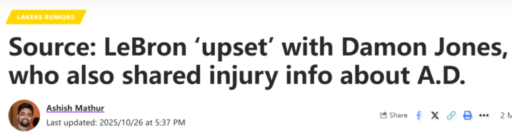 | 北京时间10月27日,据消息人士向《湖人日报》透露,湖人超巨詹姆斯对好友达蒙-琼斯向赌徒泄露其参赛状态的隐私信息一事感到“不满”。