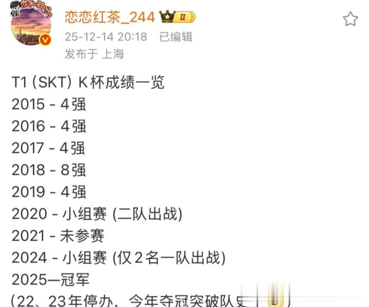 LCK赛区的K杯决赛中,T1战队最终三比二战胜了HLE战队,拿到了队伍史上第一座K杯冠军奖杯,而在此之前,faker更是连决赛都没有进去过,在这次比赛结束之后,faker更是喜提新的称号,而且是一个非常小众的称号,那就是“小赛软脚虾”,全球独一份。