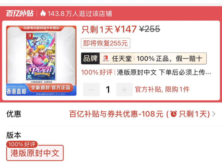友情提示:如果有刷不出我这里截图价格的玩家,建议最近多刷刷百亿补贴栏目,多搜索一下自己最近想要买的游戏,实在不行换个新号试试,某多黑号是刷不到便宜价格的实体版游戏,建议先养一下号。判断是否黑号的方法很简单,看看自己进百亿补贴专页里,右上角有无积分/会员,能否点进去兑换券,如果没有积分肯定就是黑号了。此外V1用户也可以每周连续打卡领240积分,攒着兑换一下券,买游戏能便宜一点是一点,值得注意的是次月底会清空积分,能用就尽量先用,免得过期了。值得一提的是也可以花58/68元直升半年的V3百亿补贴会员,有大量券可以领,此外每月还有一张无门槛的20元券,买游戏的话肯定回本,运气好的话还可以每天点亮刷商品,有机会获得7.5折券,买游戏更优惠。 |