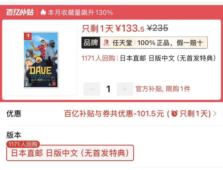 3.NS日版中文游戏《潜水员戴夫》133.5元全新包邮