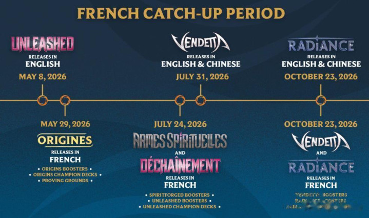 也就是说,法语版将第二系列和第三系列合并发布,将第四和第五系列合并发布。第一系列与第二系列之间留了两个月的缓冲期,第三系列与第四系列之间则是接近三个月的缓冲期。简体中文版和英文版目前尚未同步进度:英文版“破限”将于5月8日发布,但在第四系列“化神争锋”于7月31日上线时,简体中文版和英文版将实现全球同步。而当第五系列于10月23日上线时,简体中文版、英文版和法语版将迎来全球同步。 针对法语玩家可能担心无法及时玩到最新系列的顾虑,发行方明确表示,法语区店铺在法语版发行期间及之后,仍可继续订购英文版《符文战场》。目前这款卡牌游戏是不限制语言,你可以在套牌里同时使用中文、英文和法语的卡牌。值得关注的是,10月16日当周将成为法语版的重要里程碑——届时法语区将首次迎来本地语言的“Radiance”售前现开赛活动套件,与全球的“Radiance”售前现开赛窗口同步。