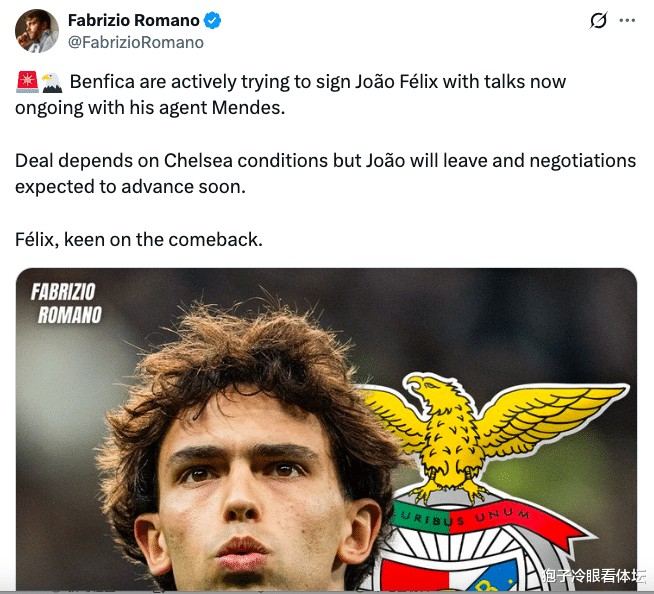 北京时间7月24日,来自著名记者罗马诺的报道,本菲卡正积极争取签下若昂·菲利克斯,目前正与他的经纪人门德斯进行谈判。整个交易取决于切尔西的条件,若昂·菲利克斯将离开,预计谈判很快就会取得进展。 菲利克斯渴望重返老东家。 葡萄牙媒体《记录报》的报道更进一步表示,菲利克斯接近重返本菲卡,切尔西接受本菲卡2500万欧收购其50%所有权。