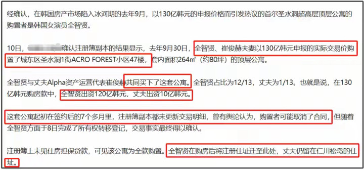 房子最终交易成功,是全款,其中女方转款120亿,男方出资10亿韩元。 房子到手之后,女方立刻把自己的户口转到了这套豪宅名下,属于单独转出。 对于豪门太太来说,一般不会轻易迁出,这意味着给外面的女人可乘之际,一旦做出了选择,大概率是离婚的前奏。