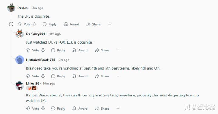 -LPL简直烂透了。 -刚刚看了DK对阵FOX的比赛。LCK太烂了。 -愚蠢的看法,你正在看到排名第四和第五队伍的比赛,甚至可能是排名第四和第六的比赛。 -只是WBG这样,他们可以随时随地领先,也可以随时送出去,他们可能是LPL最令人恶心的队伍。